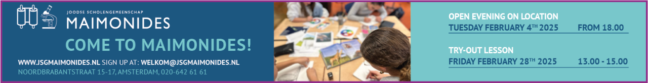 Voor de open avond en de lesjesmiddag meld je je aan door een e-mail te sturen naar welkom@jsgmaimonides.nl.