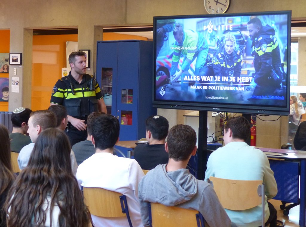De leerlingen luisterden aandachtig naar het verhaal van Daniel. Naast dat hij vertelde over zijn eigen werk als hoofdagent, vertelde hij ook over andere beroepen die je kunt doen bij de politie. Daarnaast sprak hij ook over het Joods Politienetwerk en legde uit waarom dergelijke netwerken bestaan.